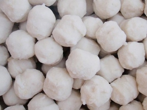 ⒉清水半锅放置在小火上,用左手抓起一把鱼糊在掌心中,右手取馅心1.5克放在左手掌中,然后左手捏拢,从大拇指,食指中挤出一只中间包有馅心的鱼丸,用调羹盛住,再倒入清水锅中,此时如锅中水已烧沸,加些冷水,不使其翻滚,待鱼丸浮到水面上,即可捞出。